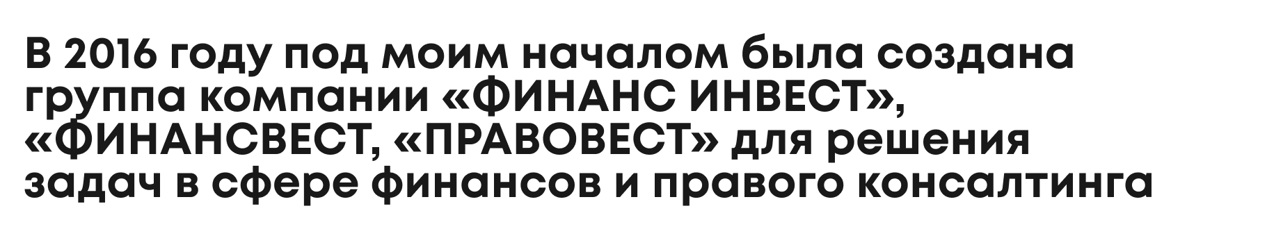 В 2016 году под моим началом была создана группа компании «ФИНАНС ИНВЕСТ», «ФИНАНСВЕСТ, «ПРАВОВЕСТ» для решения задач в сфере финансов и правого консалтинга